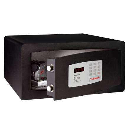 Mechanical emergency opening, key lock, 2 keys, identical keys to all safes of the hotel.