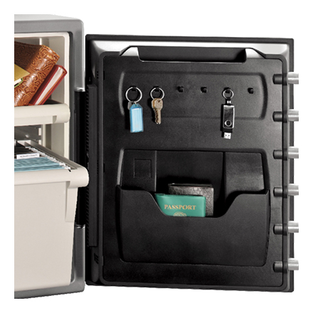 Schlüsselhalter und Aufbewahrungstasche an der Innenseite der Tresortür.