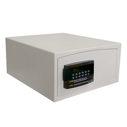 Mechanische Notöffnung, Schlüsselschloss, 2 Schlüssel, identischer Schlüssel für alle Tresore des Hotels.